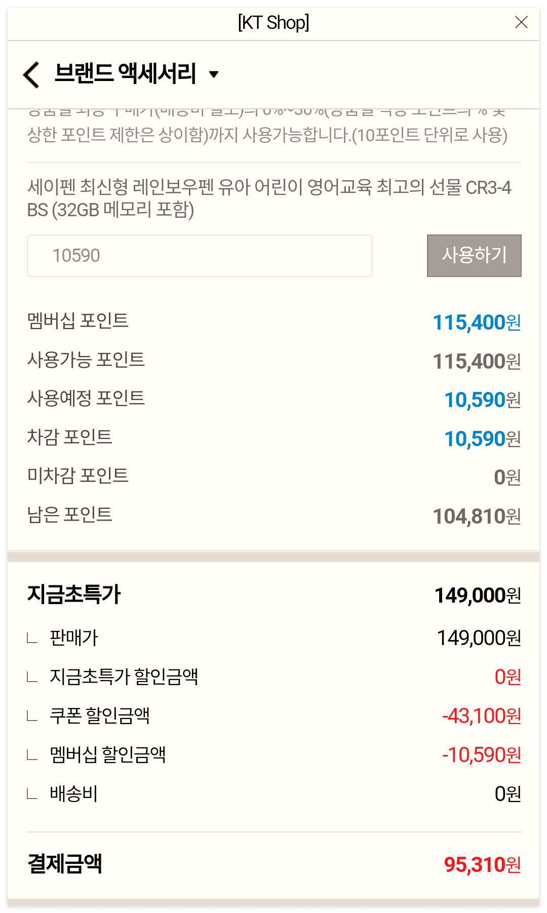 세이펜 핫딜이 있는 KT shop입니다. KT에 가입되어 있으시면 95,310원에 구입이 가능해요.
