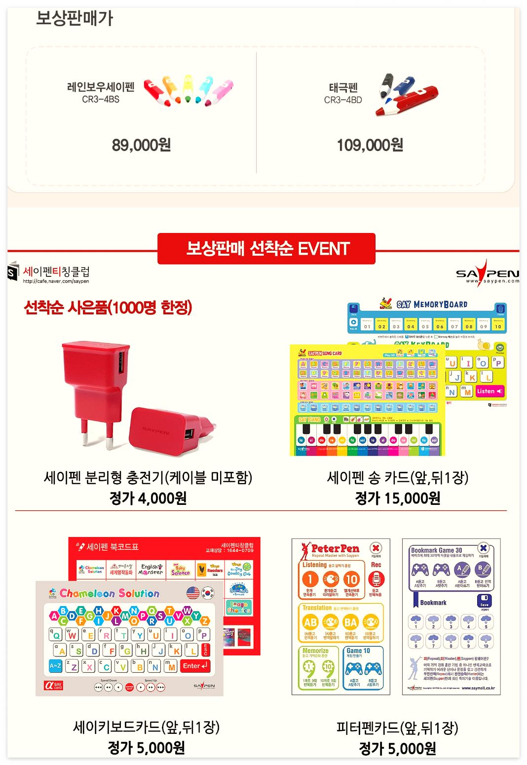 다양한 상품도 주면서 세이펜 보상판매가 이루어지고 있는데 제 기준에서는 세이펜 보상판매 치고는 가격이 싸다는 생각이 들지 않더라고요. 배송비도 별도고... 오래된 세이펜을 보내는데도 저 가격이라는 게 메리트가 있어 보이지 않았어요. 위 가격은 세이펜 네이버 카페에서 진행되고 있는 것이고, 1년에 1번 특별한 기간에 진행되는 것입니다.